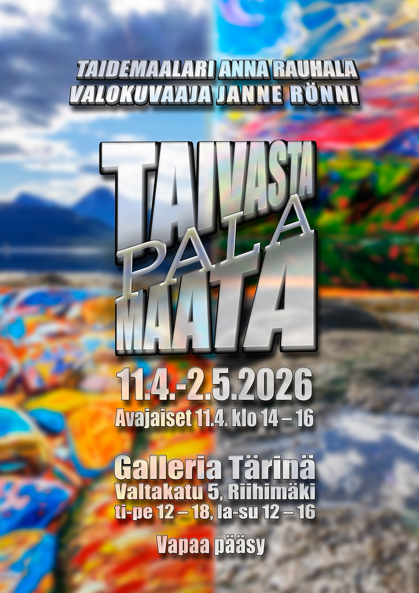 rikuta Riihimäen Kuvataiteilijat ry. täyttää tänä vuonna 70 vuotta. Ylläpidämme galleria Tärinää Riihimäellä osoitteessa Valtakatu 5.Vuoden aikana järjestämme monia juhlavuoden tapahtumia. ajankohtaista Galleria Tärinällä 11.4..-2.5.2026 Pala taivasta pala maata Taidemaalari Anna Rauhalan ja valokuvaaja Janne Rönnin taidenäyttely. menneet tapahtumat GALLERIA huhtikuu Raija Toivonen menneet ikkunanäyttelyt IKKUNAGALLERIA Rengon Säästöpankkisäätiö on mukana tukemassa Riihimäen Kuvataiteilijat ry:n toimintaa.